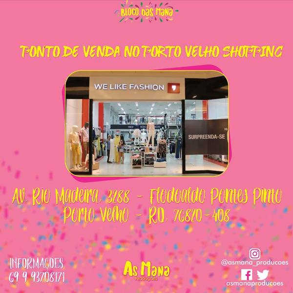 Se você ainda não comprou seu ingresso, se liga que o bloco tem vários pontos de vendas, um deles é na WE LIKE FASHION no Porto Velho SHOPPING, 2º Piso em frente a escada para o cinema.