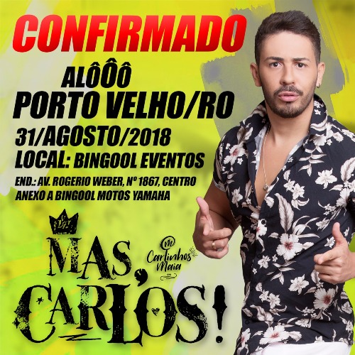 Garanta seu ingresso para o show de humor com Carlinhos Maia o Rei do Instagram e sua Turma dia 31 de agosto em Porto Velho no BINGOOL EVENTOS, às 20h. Em respeito ao público que se sentir prejudicado com a mudança de local poderá pedir o reembolso levando o ingresso no loja Cavalera do Porto Velho Shopping ou na bilheteria digital para compras realizadas on-line.
