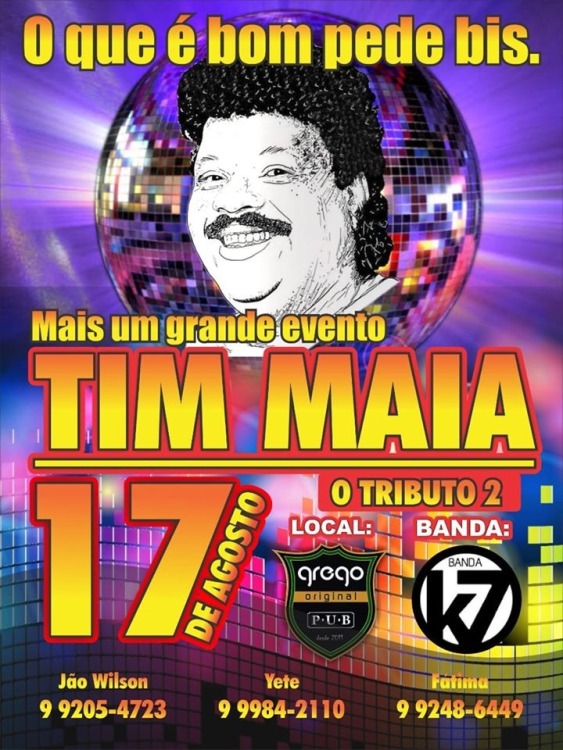 É com grande alegria que nós anunciamos o Show Tim Maia " O Tributo 2". Com o cantor Deivid Black1 e banda K7 interpretando os Melhores Hits deste grande Ícone da MPB e SOUL MUSIC Brasileira. Sem Sombra de dúvidas será uma noite Mágica com todos os Graves , Médios e Agudos.